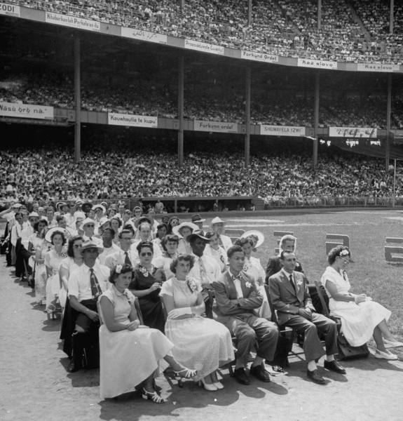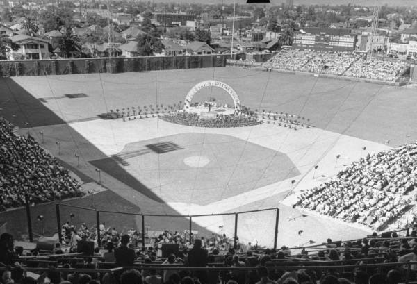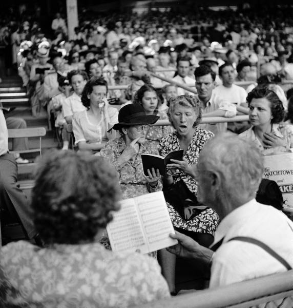 Group of Jehovah’s Witnesses attending a convention held at Wrigley Field are singing together in the stands.