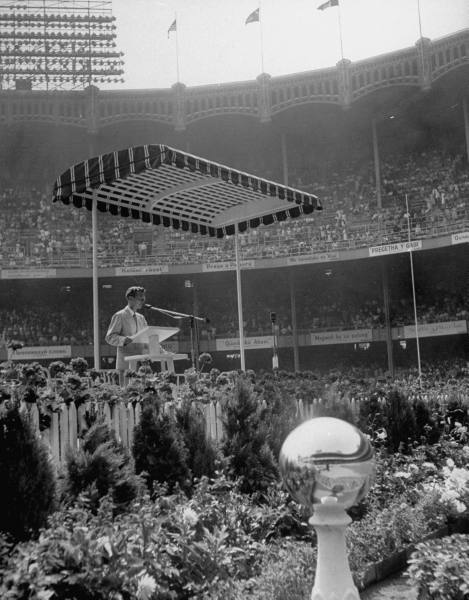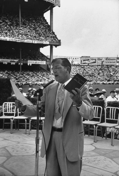 Jehovah’s Witnesses Convention at Yankee Stadium is opened officially by Convention Chairman Grant Suiter.