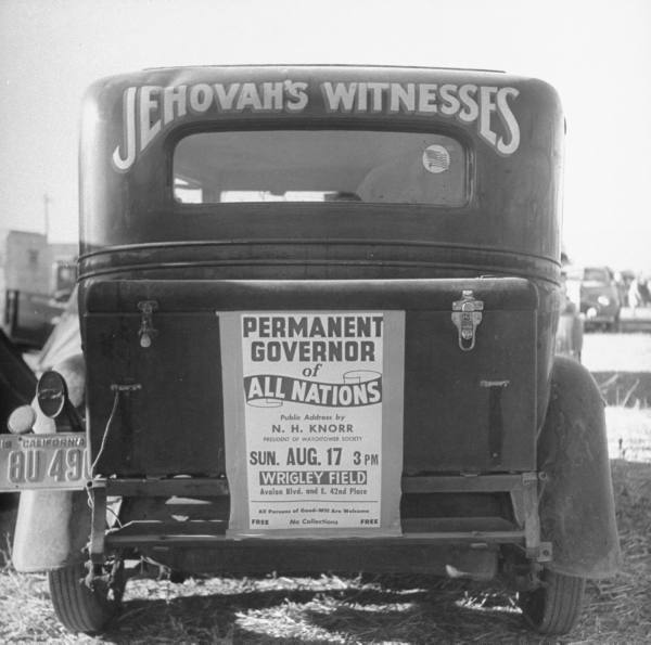 Back of car advertising for Jehovah’s Witnesses’ activities at Wrigley Field.