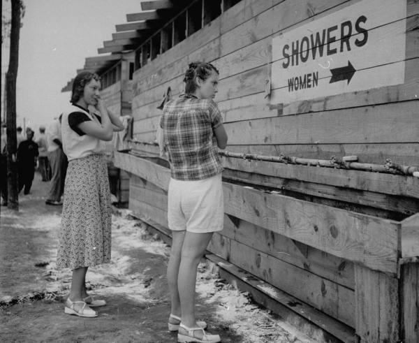 At Jehovah’s Witnesses Convention two girls set their hair in curlers outside lavatory built by Witness Labor.