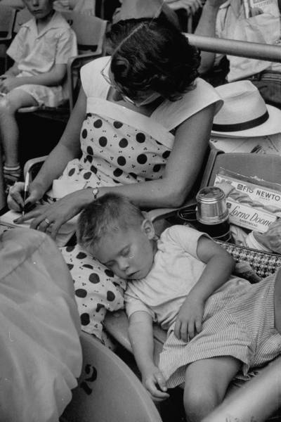 At Jehovah’s Witnesses Convention mother writing lecture notes while son sleeps on her lap.