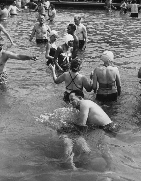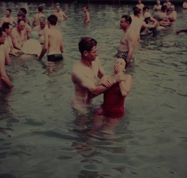 Jehovah’s Witnesses attending a mass baptism at Gay’s Pickwick Swim Park.
