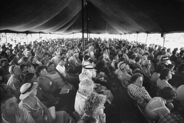 Jehovah’s Witness followers worshipping under big tent.